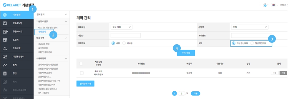 * 기본 정산계좌는 정산을 위한 계좌를 말하며, 일반 정산계좌는 그외 여분의 계좌 리스트를 칭합니다.