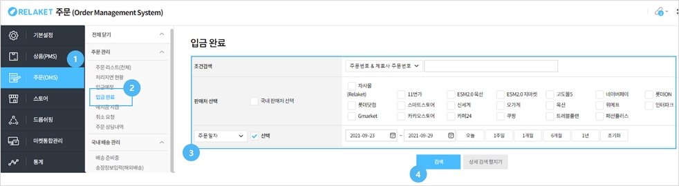 주문 관리 페이지는 마이 오피스 > 상품(PMS) > 주문 관리 > 입금 완료 페이지에서 확인이 가능합니다.