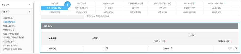 페이지 상단에서 확인되는 [가격정보(국내/해외] 버튼을 선택하시면 가격을 수정할 수 있는 영역으로 이동됩니다.