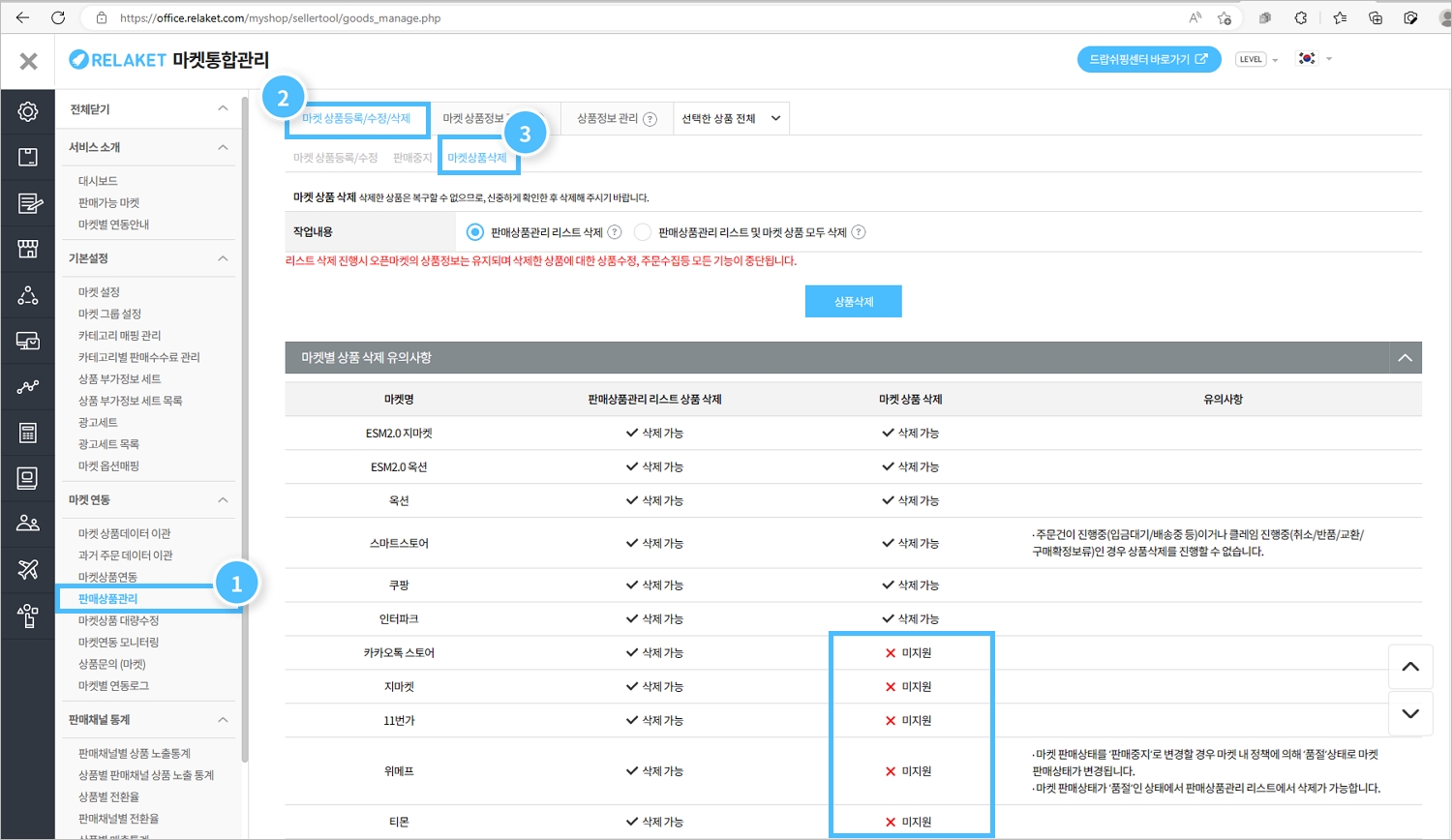 ※ 미지원 마켓의 상품 삭제는 해당 마켓에서 직접 삭제 후 릴라켓 나의 오피스 판매상품관리 리스트에서 별도 삭제해 주세요.
