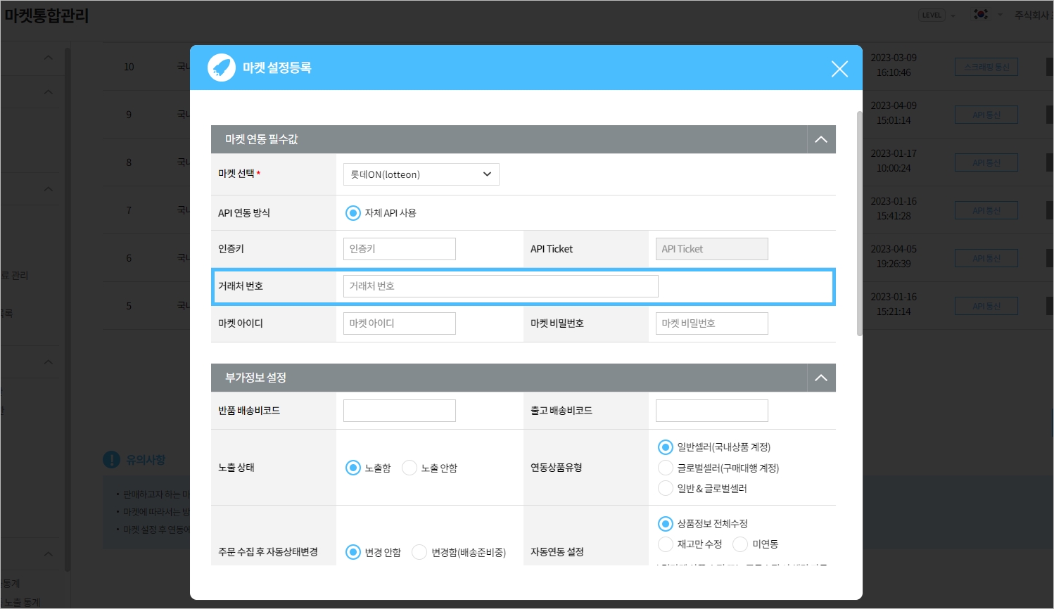 [마켓통합관리 > 서비스 소개 > 마켓별 연동안내] 메뉴에서 롯데ON의 연동 가이드 확인하시어 마켓 설정 부탁드립니다.