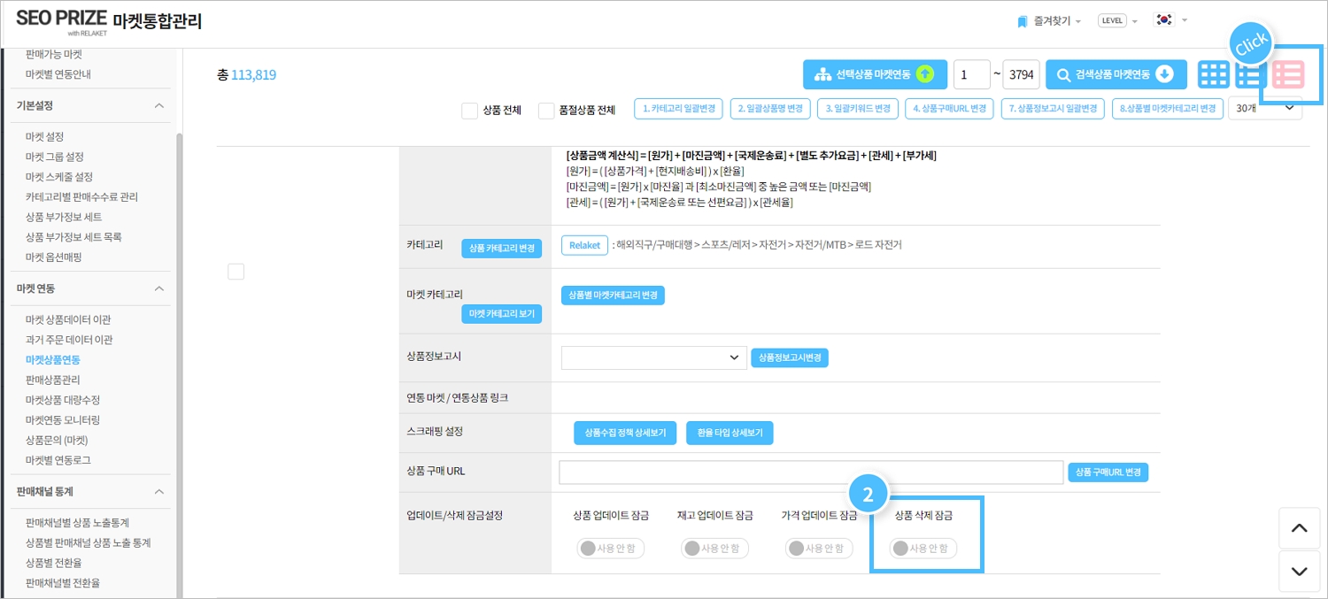 2. [마켓통합관리 > 마켓 연동 > 마켓상품연동] 메뉴에서 확인되는 [상품 삭제잠금]은 상품리스트 삭제 잠금